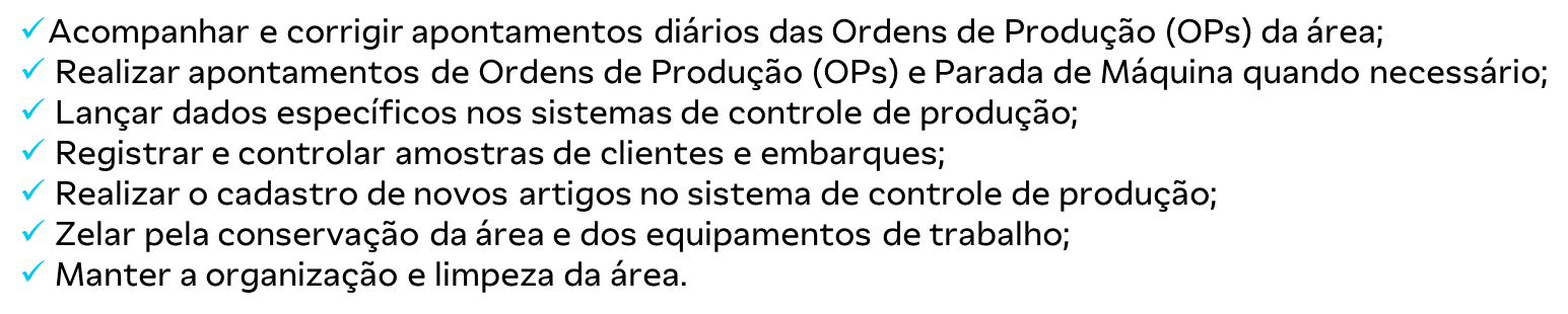 Acompanhar e corrigir apontamentos diários das Ordens de Produção (OPs) da área; - Realizar apontamentos de Ordens de Produção (OPs) e Parada de Máquina quando necessário;