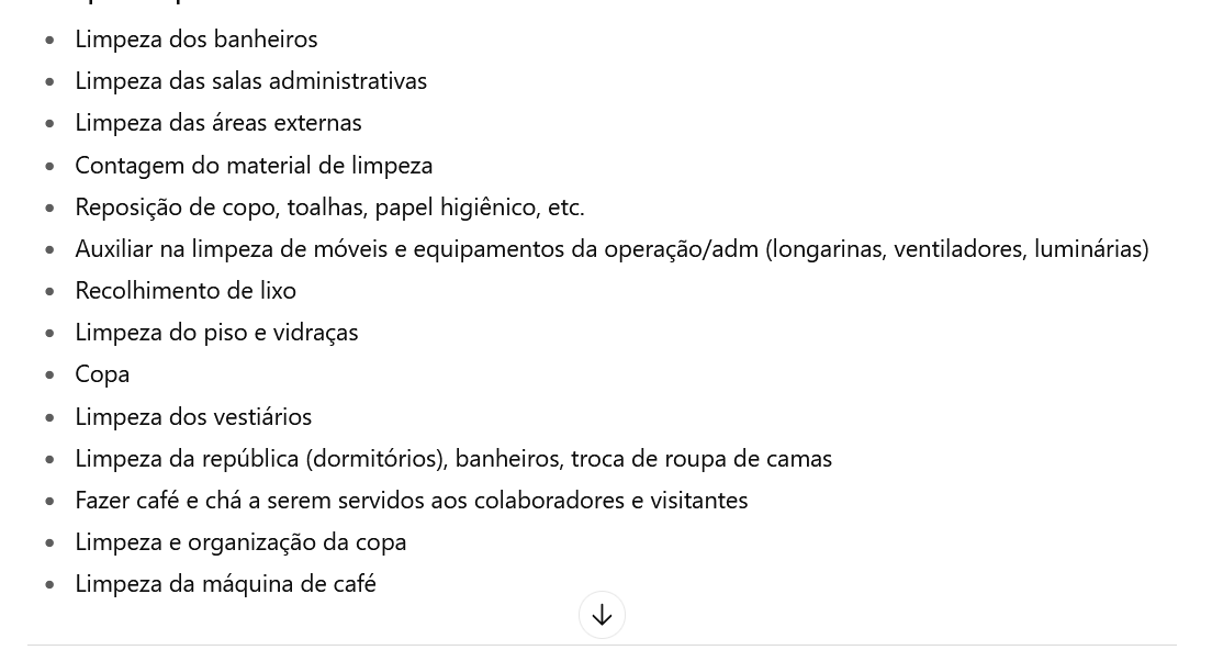 Responsável pela execução dos trabalhos de limpeza em geral dos ambientes de trabalho (operação, salas administrativas, banheiros, instalações prédias (pisos, paredes, tetos, sanitários, pias, vidraças, área externa, etc.), realizar reposição de materiais de higiene, para manutenção adequada das condições de higiene e conservação dos ambientes.